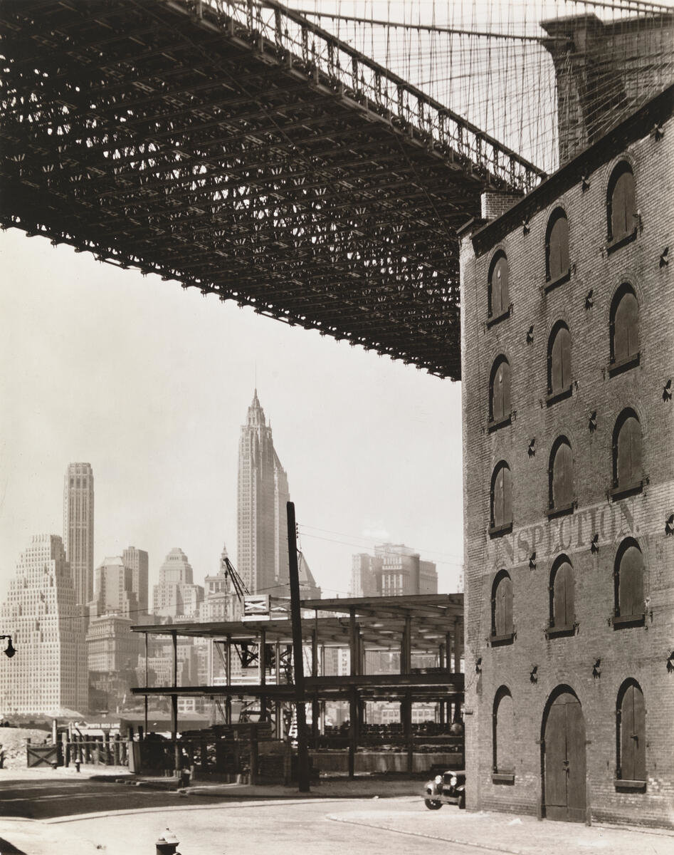 Berenice Abbott (American, 1898–1991), Brooklyn Bridge, Water and New Dock Streets (from Changing New York), 1936
