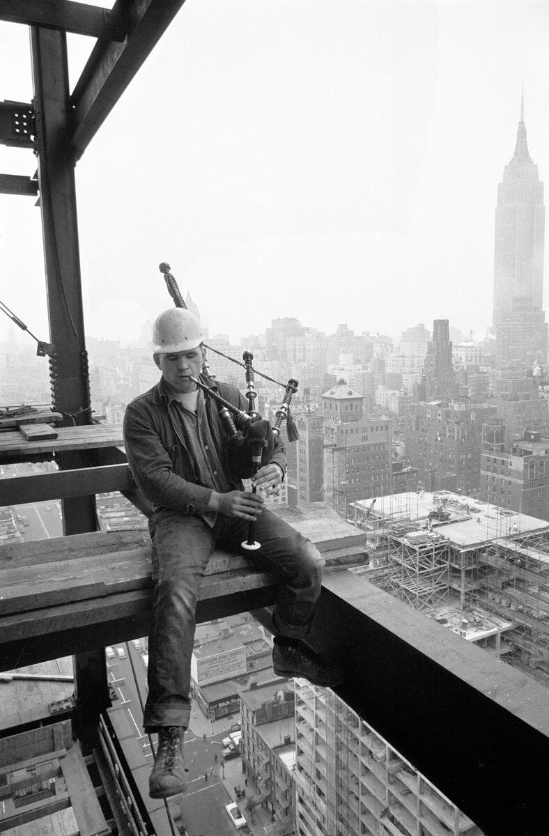 Arthur Rothstein (American, 1915–1985) and Frank Bauman (American, 1914–1974) for Look magazine, [Construction Worker Playing a Bagpipe and Sitting on Scaffolding], 1957